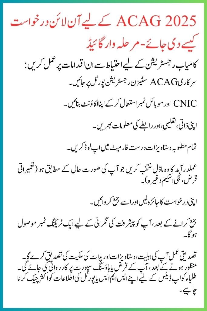 The ACAG 2025 scheme is now open for online registration through its official portal. The government has introduced three models: (1) state land development, (2) private housing schemes, and (3) interest-free construction loans. The third option is especially appealing for students who already own plots of 1–5 marla in urban or 1–10 marla in rural areas.