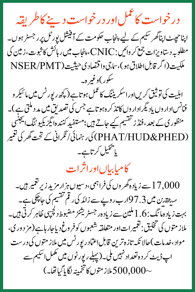 Apni Chhat Apna Ghar Scheme is a housing initiative by the Government of Punjab under Chief Minister Maryam Nawaz. It aims to provide affordable housing for low‑income families through interest‑free or very low cost loans, and thus reduce homelessness, improve living standards, and generate jobs.
