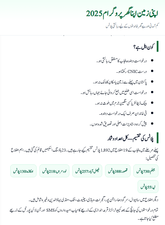 The Apni Zameen Apna Ghar Program 2025 is a groundbreaking housing initiative by the Punjab Government to help poor and homeless families. By offering free residential plots, transparent online systems, and fair balloting, the program is making the dream of home ownership a reality for thousands.