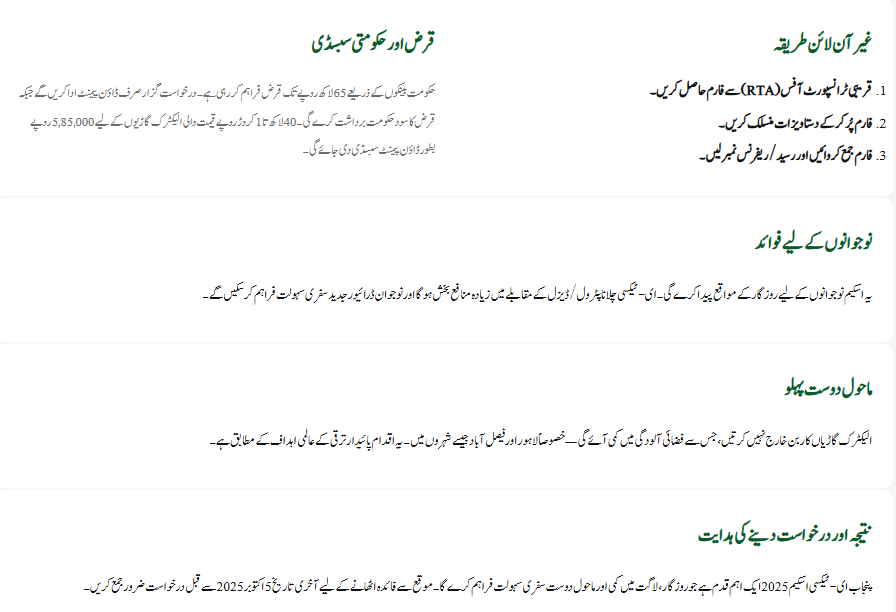One of the biggest benefits of the Punjab E-Taxi Scheme 2025 is financial assistance. The government has arranged loans of up to Rs. 6.5 million through banks. Applicants only need to pay the down payment, while the government will cover the interest. Additionally, for electric vehicles priced between Rs. 4 million and Rs. 10 million, the government will provide Rs. 585,000 as down payment support. This makes it much easier for ordinary citizens to purchase a vehicle.