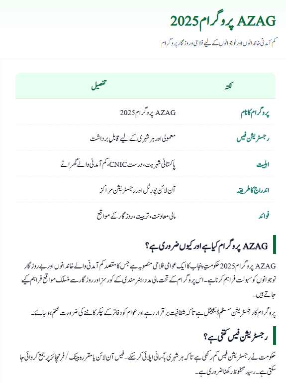 The AZAG Program 2025 is a welfare initiative launched by the Government of Punjab to help low-income families and unemployed youth. The program offers not only financial support but also skill development courses and job linkages to help applicants build a secure future.