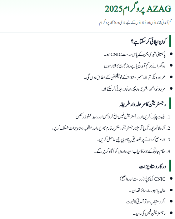 This program mainly targets people who are struggling due to poverty, unemployment, or lack of education. The AZAG Program 2025 is a new ray of hope that will benefit individuals as well as contribute to the country’s overall progress.