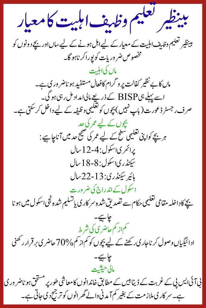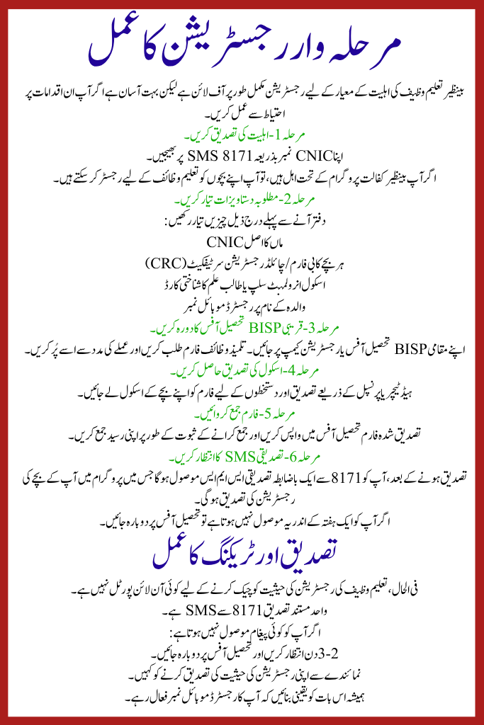 If you are eligible under the Benazir Kafalat Program, you can then register your children for Taleemi Wazaif.