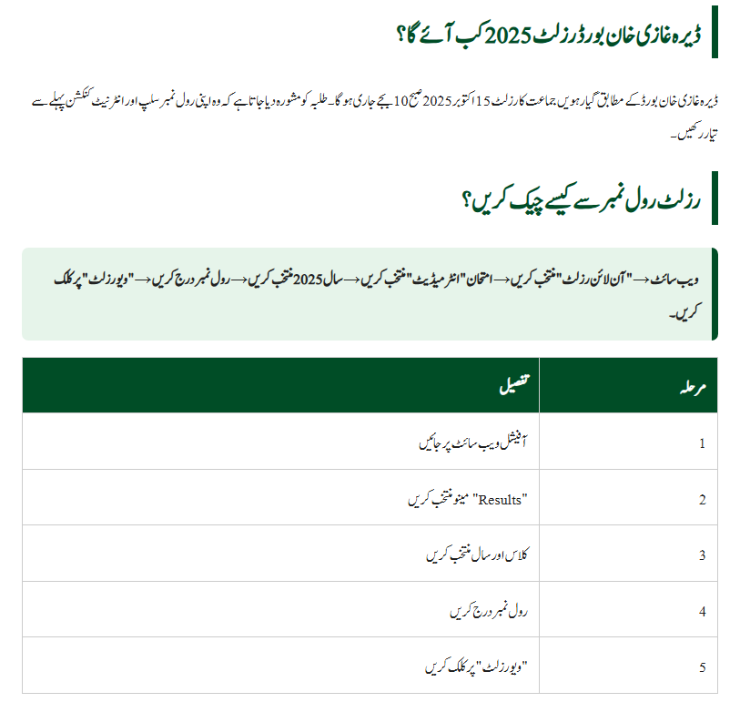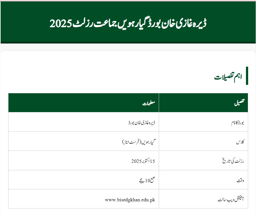 The most searched question is: When will the result be released? According to the D.G. Khan Board, the BISE D.G. Khan Board 11th Class Result will be announced on October 15, 2025, at 10:00 AM. Students are advised to keep their roll numbers and internet connection ready to check their results on time without delays.