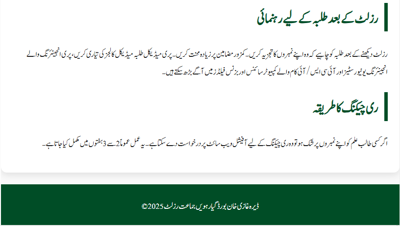 The BISE D.G. Khan Board 11th Class Result 2025 is a crucial milestone for students beginning their intermediate journey. Whether it brings happiness or motivates for more hard work, it definitely guides students toward their future goals. With multiple methods to check the result—roll number, name, SMS, and Gazette—students can easily access their performance details. The real key to success lies in continuous hard work, confidence, and learning from every result.