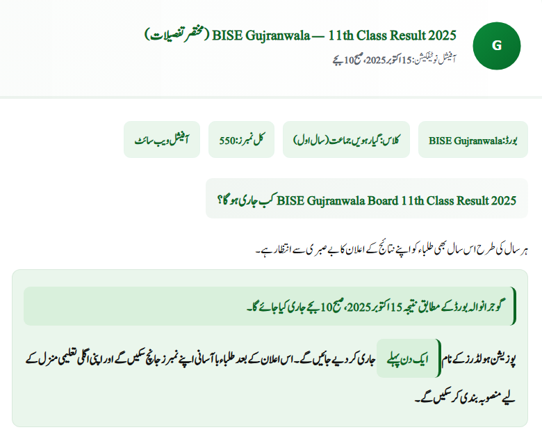 For thousands of students and parents, the announcement of the BISE Gujranwala Board 11th Class Result 2025 is a turning point. This result reflects not just a year of hard work but also sets the direction for every student’s educational journey ahead. After the first-year exams held in March 2025, all eyes are now on October 15, 2025, when the results will finally be revealed.