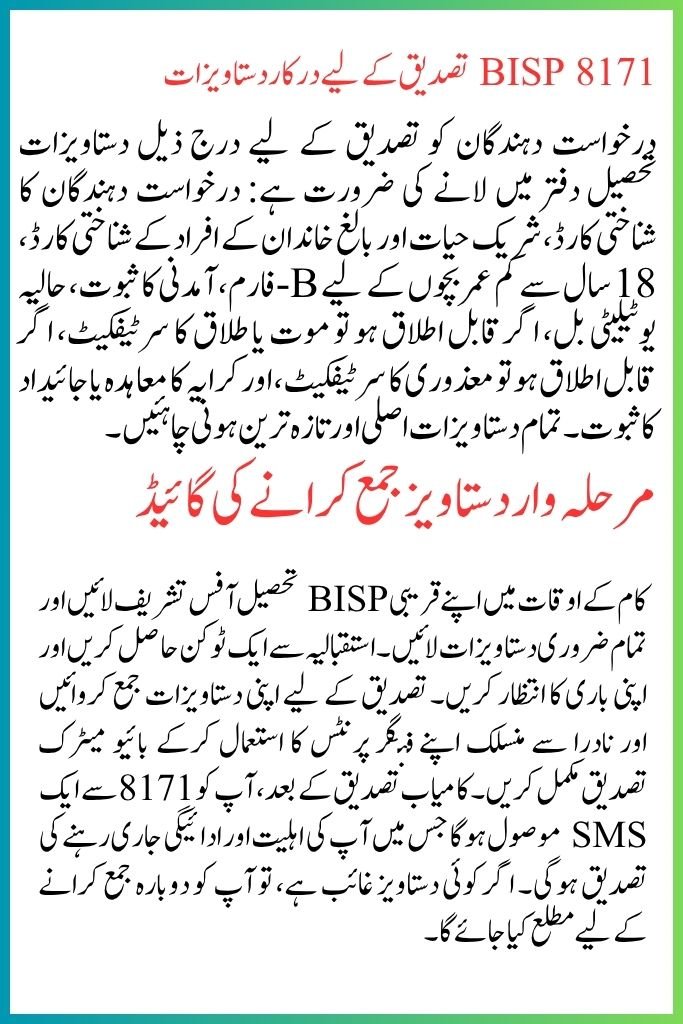 Visit your nearest BISP Tehsil Office during working hours and bring all necessary documents. Get a token from the reception and wait for your turn. Submit your documents for verification and complete biometric verification using your fingerprints linked to NADRA. After successful verification, you will receive an SMS from 8171 confirming your eligibility and payment continuation. If any document is missing, you will be notified to resubmit.