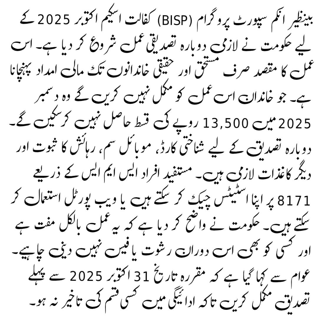 The BISP Kafalat October 2025 re-verification is a game-changer for poor families. With the deadline fixed as October 31, 2025, beneficiaries must act now to secure their December installment of Rs. 13,500. Prepare all required documents, use SMS or the 8171 portal, and visit your nearest BISP office for biometric verification if needed.
