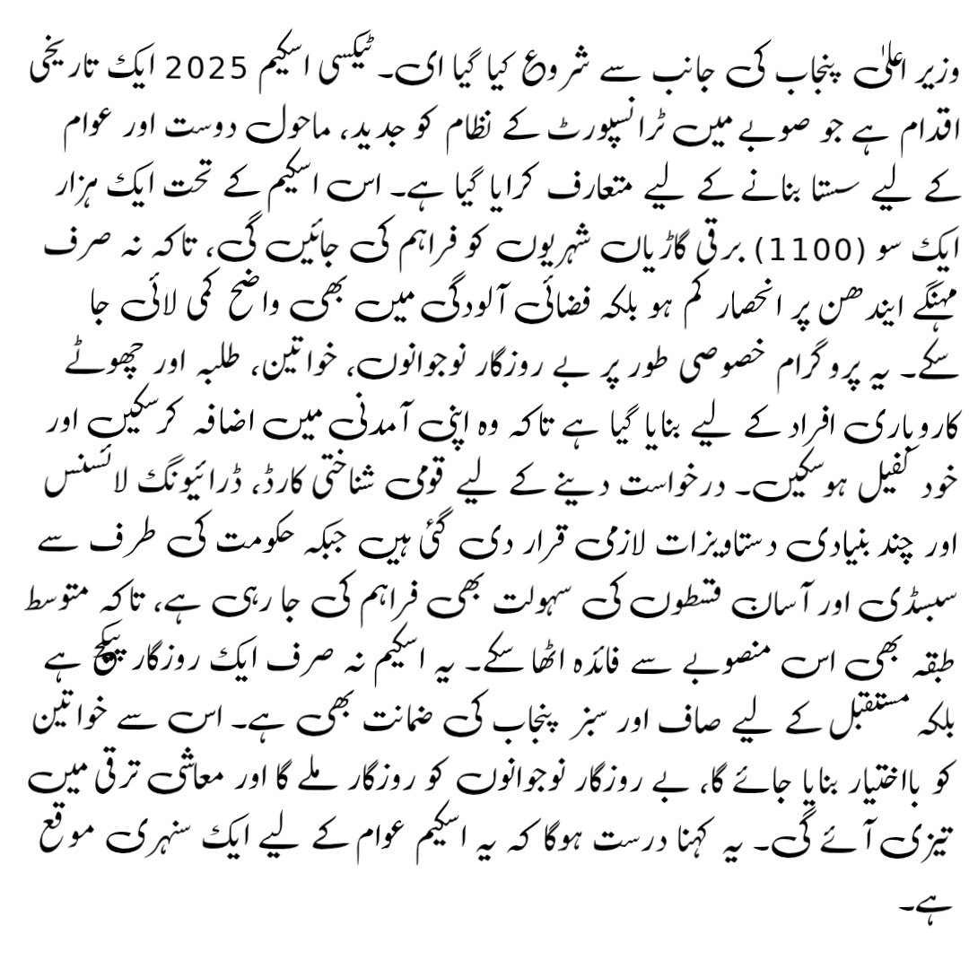 The scheme is open to Punjab citizens with a valid CNIC. Special consideration is given to women, students, and unemployed youth. Applicants must also hold a valid driving license if applying as a taxi driver.