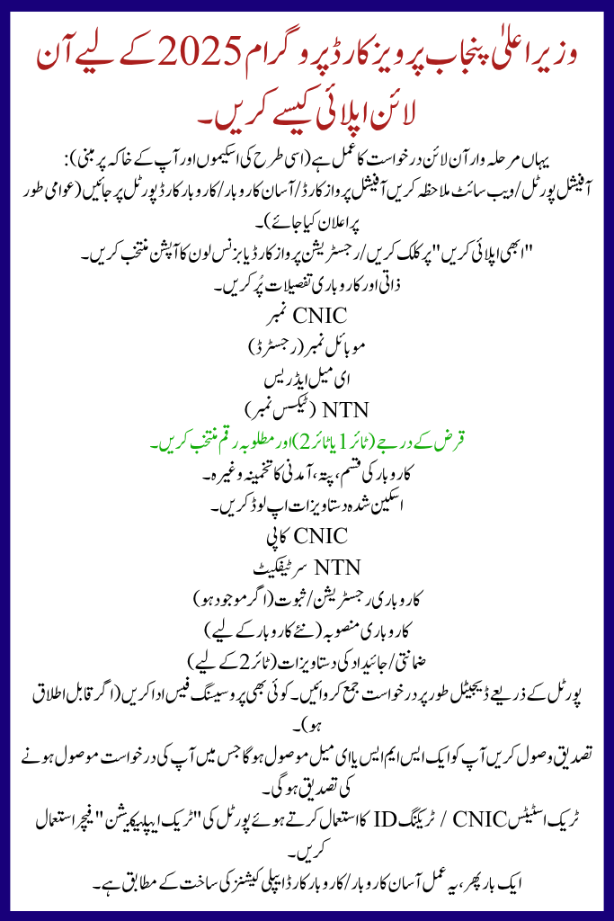 The CM Punjab Parwaz Card Program 2025 – Online Apply offers a important chance for entrepreneurs in Punjab to access interest-free business funding. With a simplified online application, tiered loan structure, and added support for women and youth, it is designed to foster business growth and service.