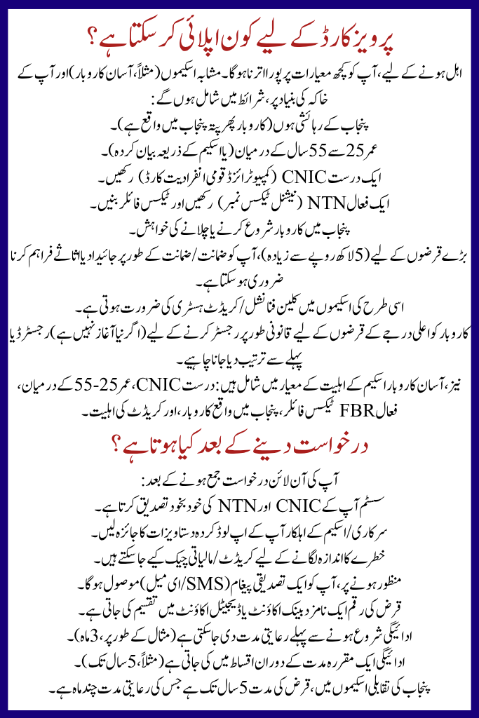 Also, Asaan Karobar scheme’s eligibility criteria include: valid CNIC, age between 25–55, active FBR tax filer, business located in Punjab, and credit worthiness.