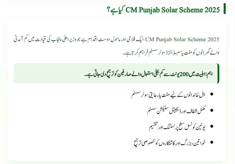 The CM Punjab Solar Scheme 2025 is a flagship clean energy initiative launched under the leadership of Chief Minister Maryam Nawaz Sharif. Its main goal is to provide free or subsidized solar panel systems to low-income households across the province so they can generate their own electricity and reduce dependency on costly power.