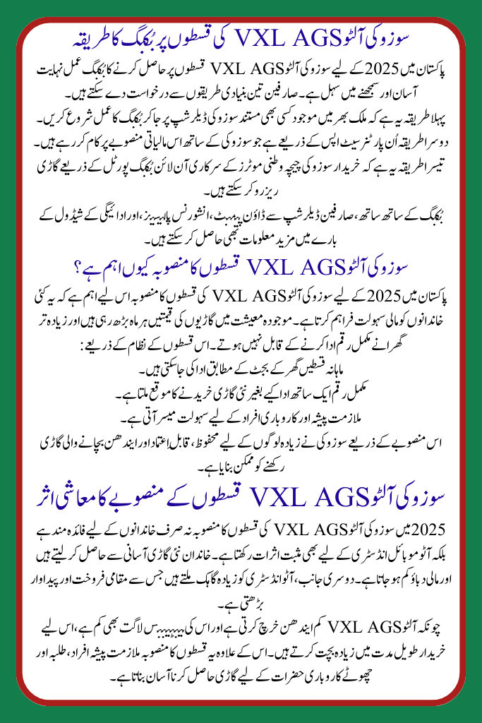 The economic impact of the Suzuki Alto VXL AGS installment plan in 2025 is optimistic for both families and the automobile industry. Families advantage by receiving admission to new cars without heavy monetary stress. At the similar time, the auto industry gains more clienteles, which ropes local sales and manufacture. Meanwhile the Alto VXL AGS is fuel-efficient and has low maintenance costs, buyers save cash in the extended term. Moreover, the payment program increases accessibility, helping paid persons, scholars, and even small business proprietors attain car possession more effortlessly.