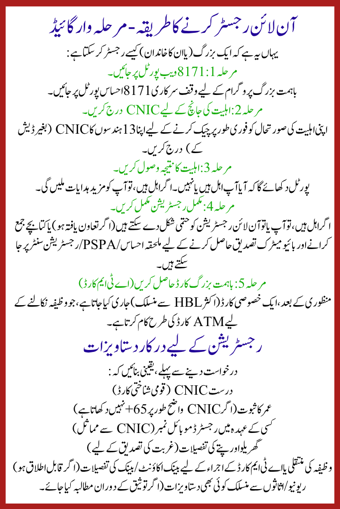 • Digital & Offline Modes: Registration is imaginable via 8171 web doorway, via SMS in particular cases, or at physical Ehsaas / PSPA / enablement centers.