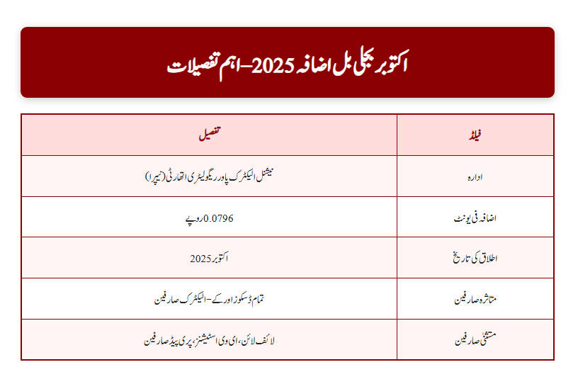 The National Electric Power Regulatory Authority (NEPRA) has approved an increase of Rs. 0.0796 per unit in electricity bills for October 2025. This rise will apply to all power distribution companies (DISCOs), including K-Electric consumers across the country.
