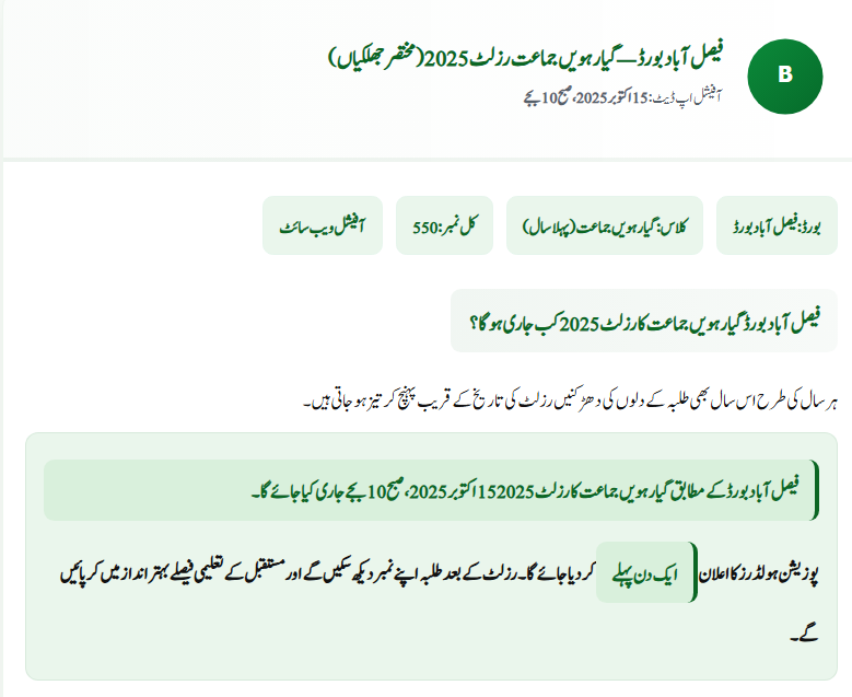 Like every year, the excitement grows as the result date gets closer. According to Faisalabad Board officials, the 11th Class Result 2025 will be announced on October 15 at 10:00 AM. Position holders will be revealed one day before the official result. Once the result is live, students will be able to check their marks and plan their academic future more confidently.