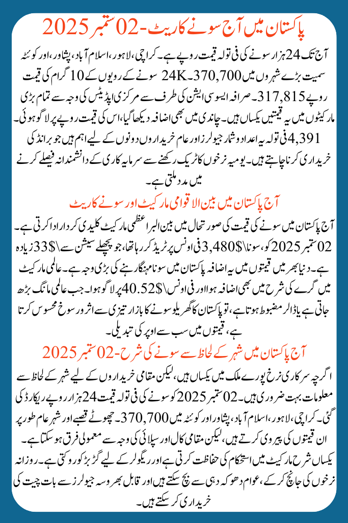 The intercontinental market plays a key part in situation the gold rate in Pakistan today. On 02 September 2025, gold was trading at \$3,480 per ounce, which is \$33 higher than the last session. This rise in worldwide prices is the main reason why gold remains so expensive in Pakistan. The rate of gray also increased in the global market and was logged at \$40.52 per ounce. When global demand rises or the dollar develops stronger, Pakistan’s domestic gold bazaar quickly feels the influence, top to price changes.