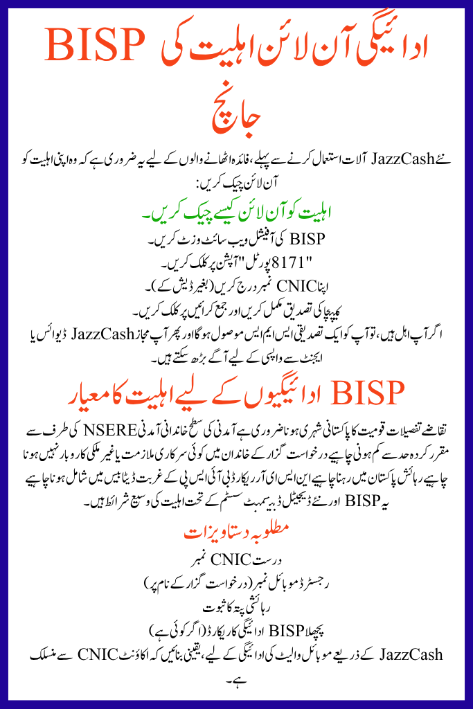 Before using the new JazzCash Launches New Devices for BISP Payments 2025, it is important for beneficiaries to check their eligibility online: