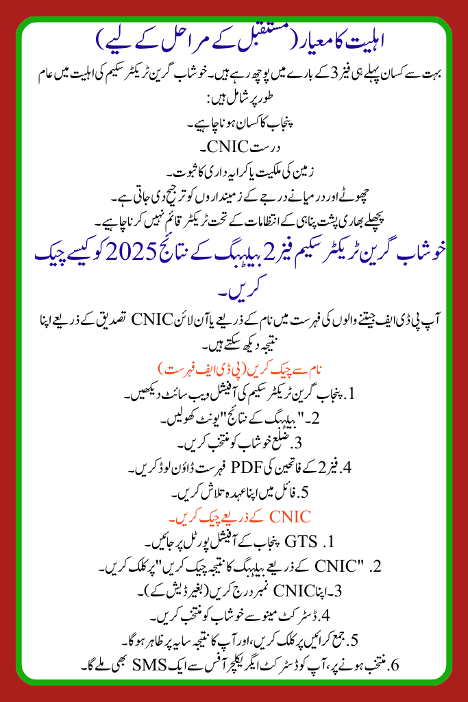 Many farmers are already asking about Phase 3. Eligibility for Khushab Green Tractor Scheme usually includes: