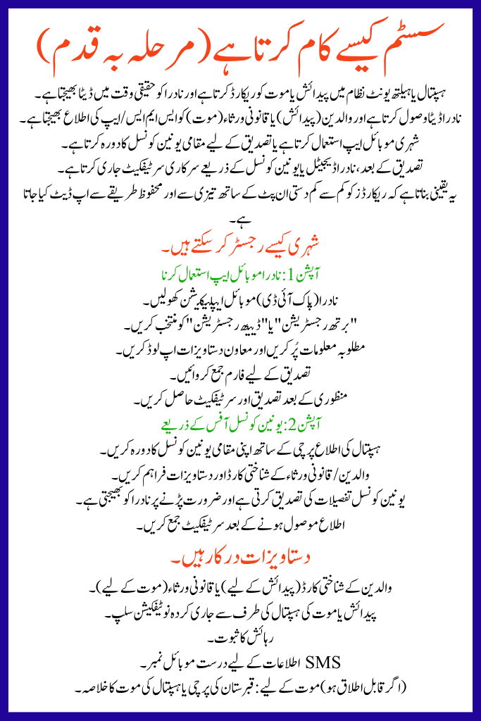 - Possibly enable overseas Pakistanis to register births or deaths abroad via the system.