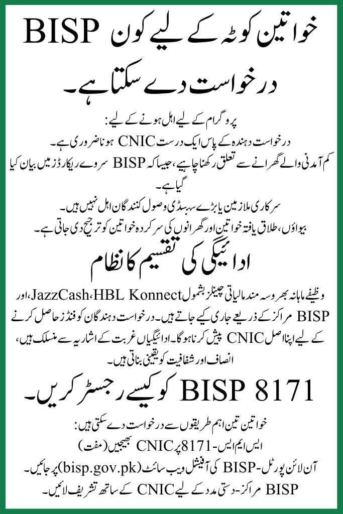 | Payment Channels | HBL Konnect, JazzCash, BISP Payment Centers |