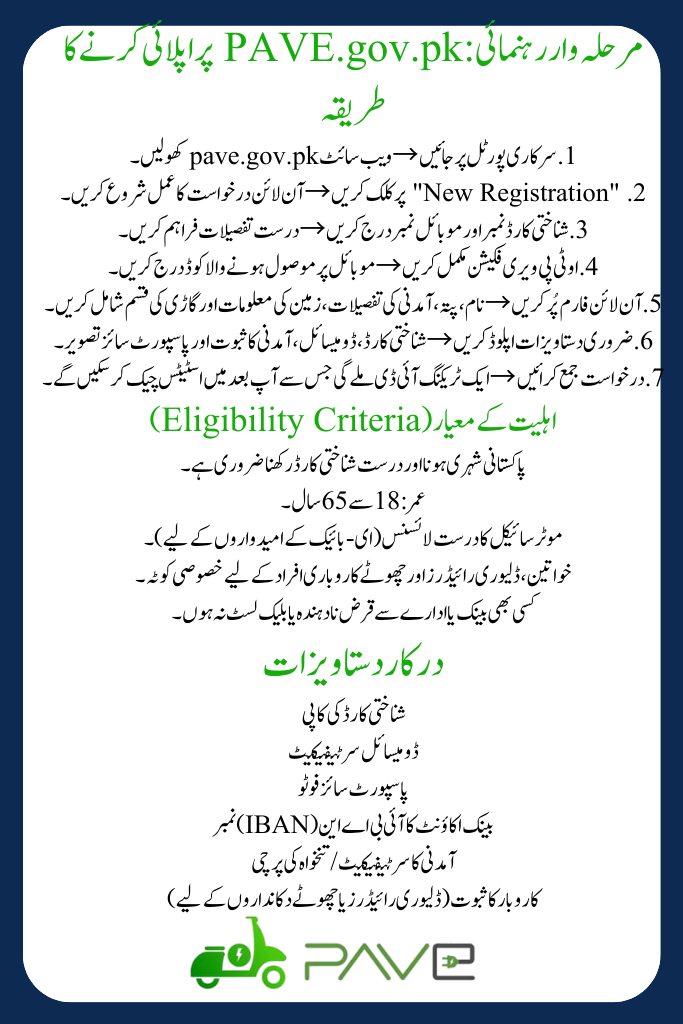 The Pakistan Accelerated Vehicle Electrification (PAVE) Program 2025 is one of the country’s most ambitious initiatives, designed to make electric mobility affordable for everyone. Under this Online Registration for PAVE Scheme, citizens can purchase electric bikes, rickshaws, and loaders at subsidized prices with flexible installment plans.