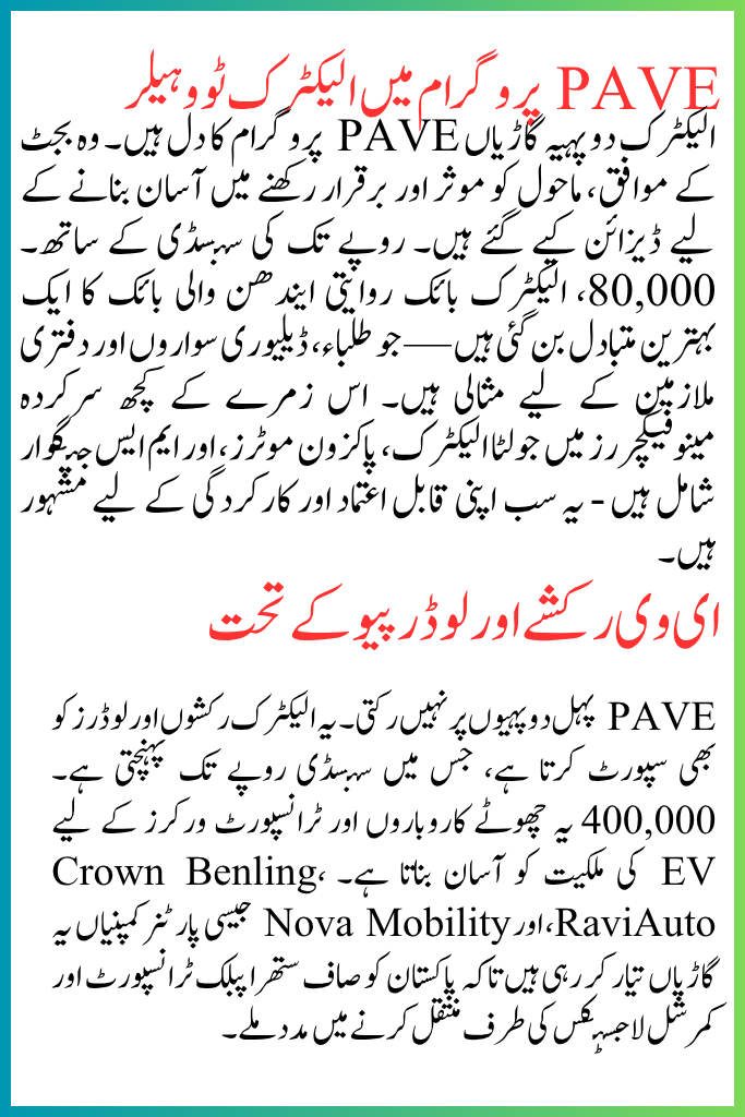 The PAVE initiative doesn’t stop at two-wheelers. It also supports electric rickshaws and loaders, with subsidies reaching up to Rs. 400,000. This makes EV ownership easier for small businesses and transport workers. Partner companies like Crown Benling, RaviAuto, and Nova Mobility are manufacturing these vehicles to help Pakistan shift toward clean public transportation and commercial logistics.