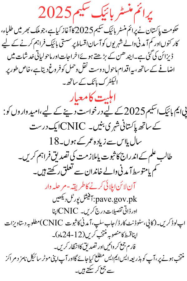 The PM Bike Scheme 2025 has become the talk of the town in Pakistan. Many students, teachers, and low-income employees are searching for an easy way to apply online at pave.gov.pk. This new government initiative aims to provide affordable bikes on installment plans so that people can save money, reduce travel stress, and move easily from one place to another. If you are a student, a teacher, or a job holder struggling with transport problems, this guide will explain everything you need to know about the scheme.