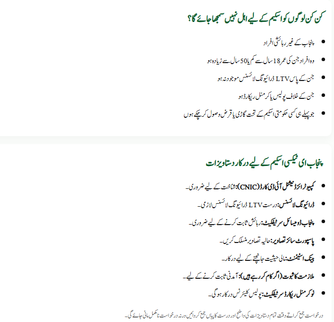 The Government of Punjab has introduced a golden opportunity for the youth under the Punjab E-Taxi Scheme 2025. Through this scheme, thousands of individuals will be able to earn a livelihood by owning and operating their own taxi. However, certain eligibility conditions have been set so that only genuine and deserving applicants benefit from it. This article will guide you step by step on who is eligible, who is not, and what documents are required. By the end, you will be able to check your eligibility and prepare everything before applying.