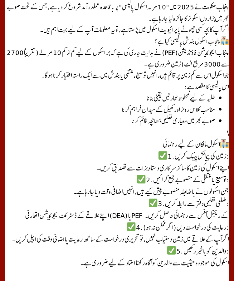 Every school in Punjab must be built on a minimum 10 Marla plot. Schools smaller than this must either expand or shift to a compliant location.