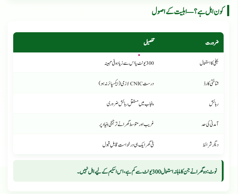 | Eligibility | Families using 300+ electricity units per month |